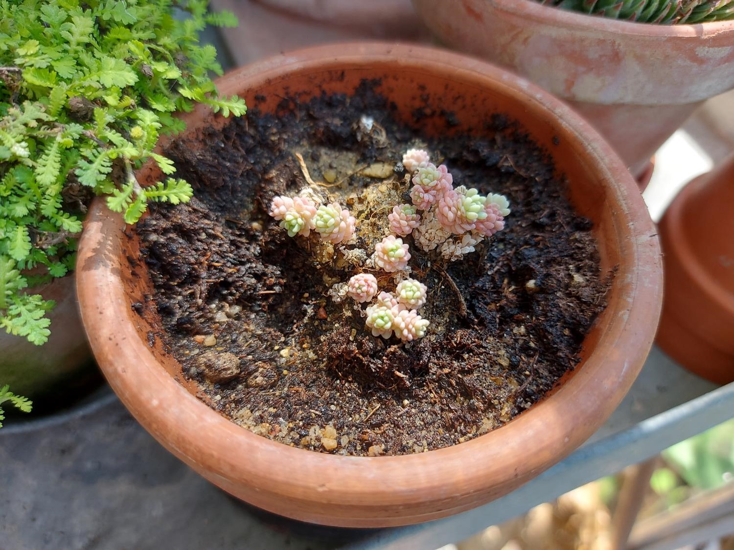 og de sjove, små knottede sukkulenter, jeg fik af Morten fra Staudeblomsten for et par år siden. De skulle egentlig være ude, men de bittesmå knotter klarede ikke rigtig konkurrencen fra bedets øvrige planter, der er af den grønne og vildtvoksende slags. Jeg reddede stumperne, og det ser ud til, de er ved at få livsmodet tilbage.