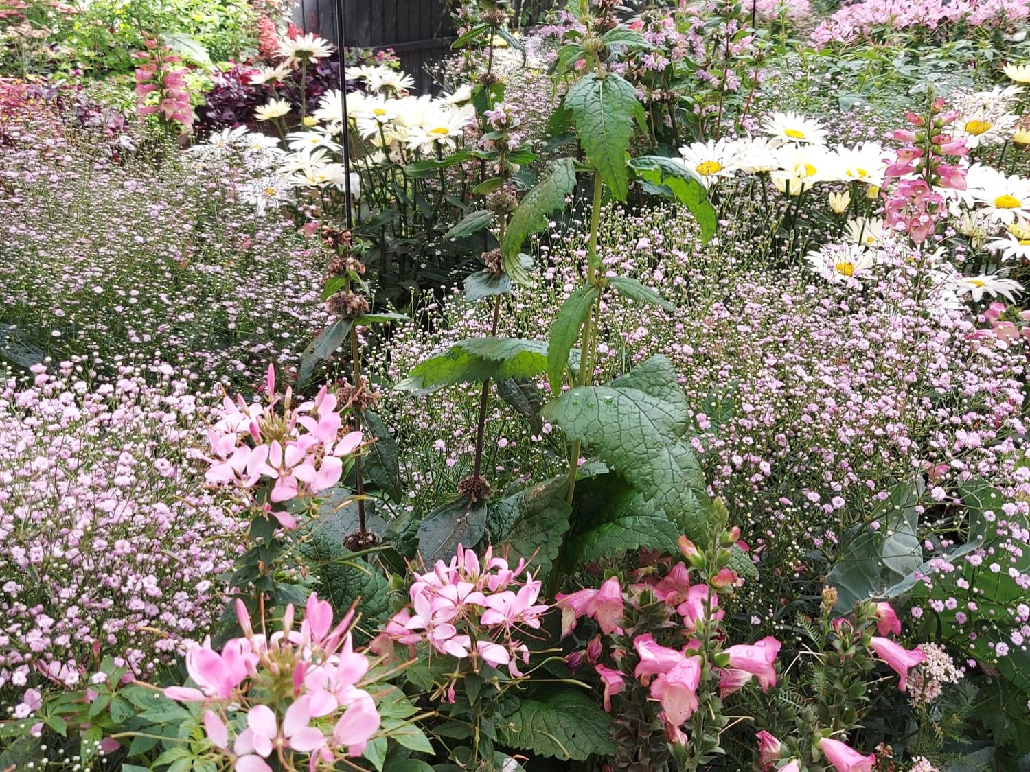 Resten af haven er fyldt med fantasifulde opstillinger og smukke bede. Der er rumblomster i et bed med en flyvende tallerken, en raket, røg og rumkugler (ikke romkugler, altså),