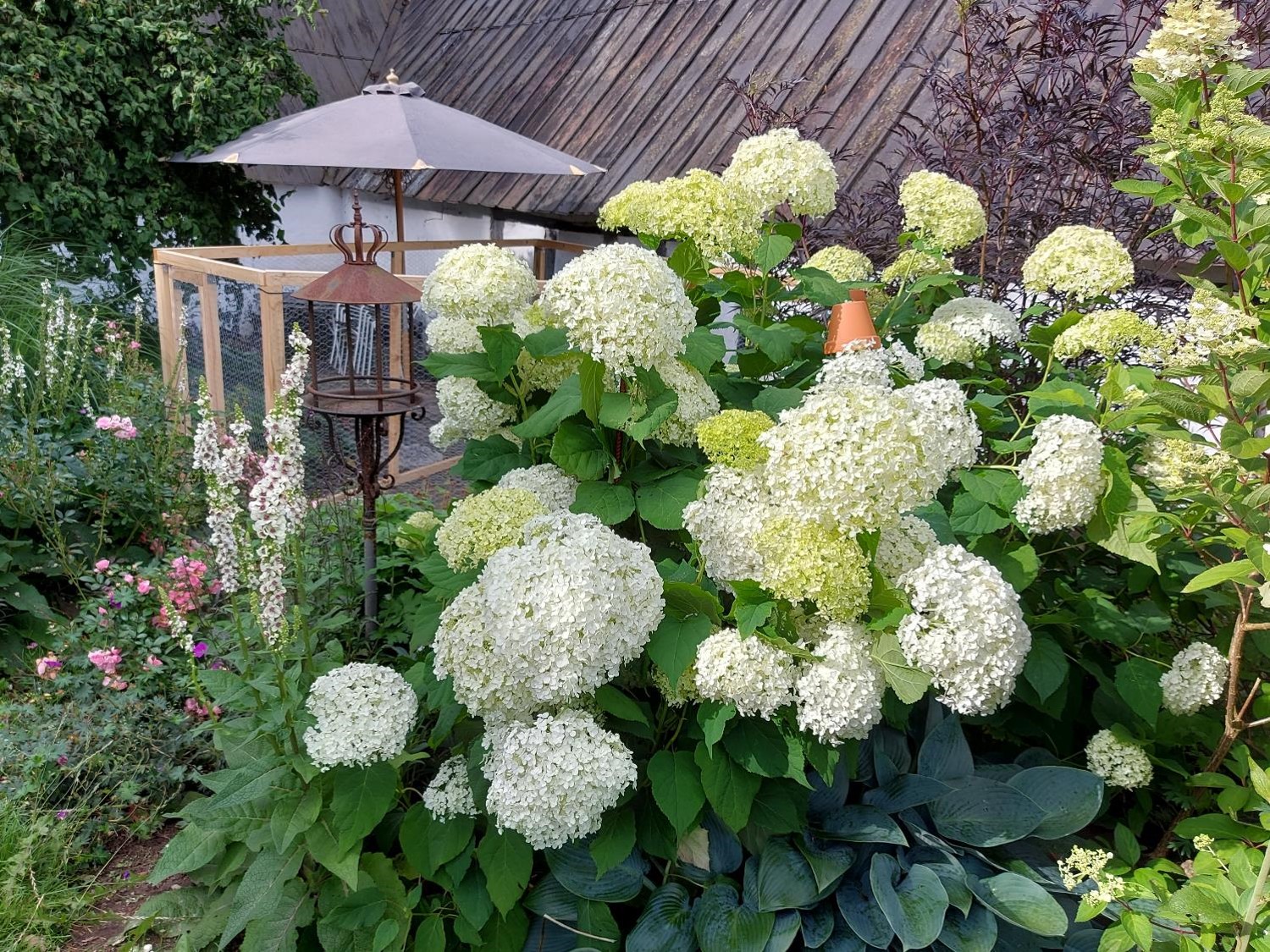 Der er kanter, der trænger til at blive rettet af. Der er planter, der trænger til beskæring. Der er ukrudt, der er kommet snigende – blandt andet mødte jeg en brændenælde, der stak næsen op i små to meters højde gennem Annabelle hortensiaen. Jeg sværger på, den ikke var der i går… Man kan da heller ikke vende ryggen til den agressive natur i et øjeblik.