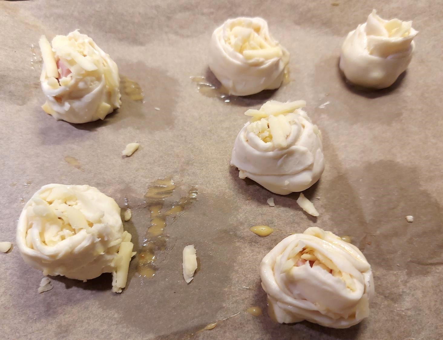 Roserne er ikke svære at lave. Man stikker en cirkel ud (med et glas, hvis man ikke har en rund udstikker), skærer fire snit overfor hinanden halvvejs ind in cirklen som på billedet herunder, smører med æg, og putter lidt skinketern og lidt revet ost på midten.