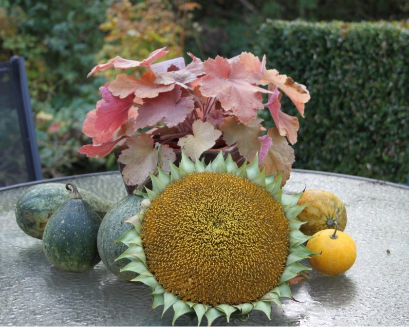 Solsikkerne springer ud over lang tid. Nogle er næsten afblomstrede, nogle står i fuldt flor, nogle er lige ved at springe ud, og andre står kun i knop endnu. Vi vil kunne nyde det skønne syn af den lange, gule stribe og af buketter i huset i lang tid endnu. Og senere vil fuglene holde fest deroppe. Solsikker er god næring for små fugle på træk.