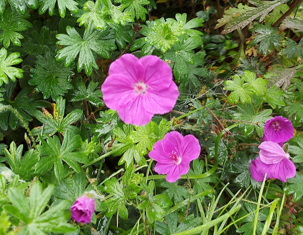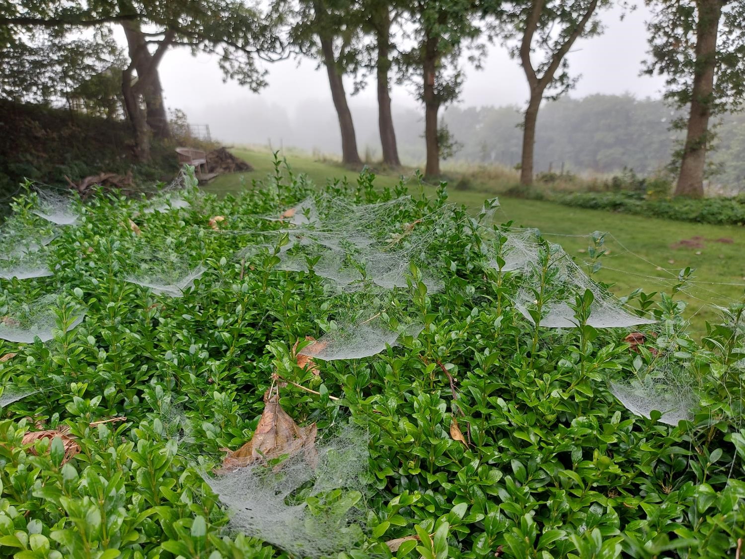 Det gør det altså også noget sjovere for os mennesker at lufte dem. For vi kan gå og beundre spindelvævene og den bløde, tågedækkede udsigt, og når vi kommer ind haven kan vi nyde de stærke farver på blomsterne og de blanke, våde blade.