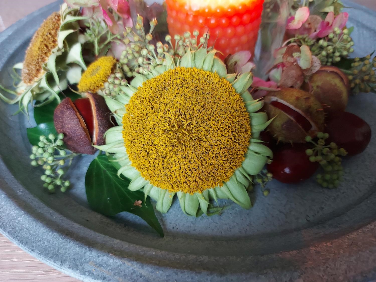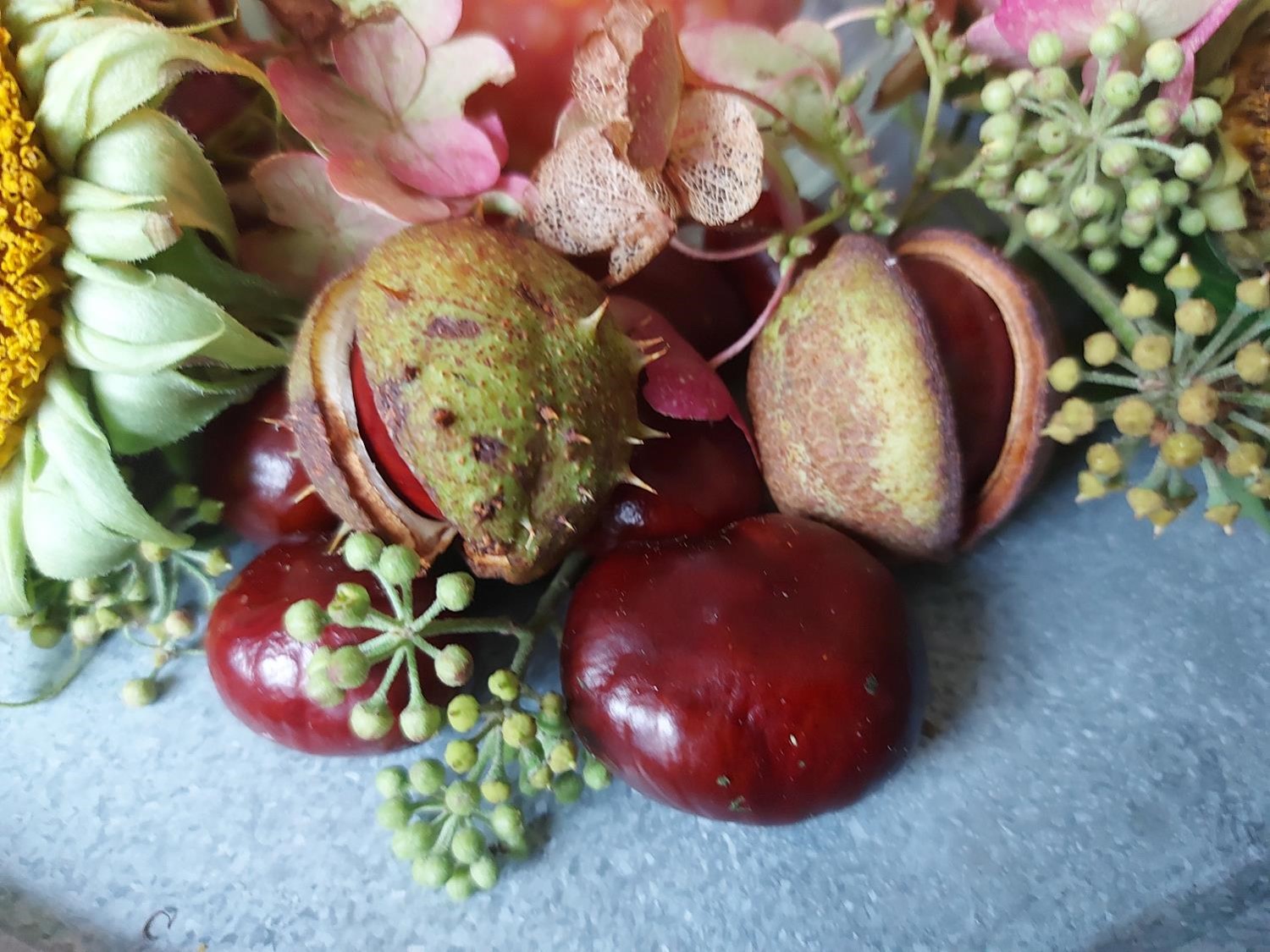 I går sagde jeg farvel til den sidste store buket, men frøstandene nænnede jeg ikke at kassere, og de fik lov at pynte videre på et fad med andet efterårsguf – kastanjer, tørre hortensia og efeublomster.