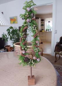 Endnu en dekoration har fundet sin plads i huset på den gamle servante, hvor kobberting har det med at søge hen. Det er et lille træ, bundet på et spinkelt trådskelet og anbragt i den fineste kobberholder.