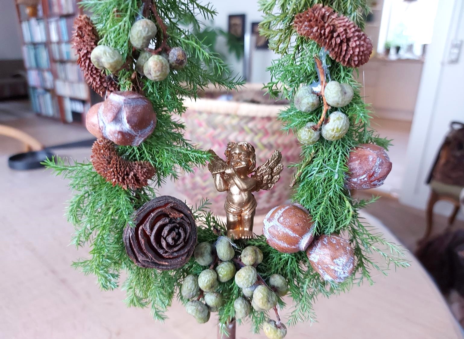 Lidt skamfuld gav jeg keruben ærespladsen i bunden af træet. Dens pind passede lige ned i holderen, som træet står i, så han havde ret, den lille fyr. Han skulle også med til kobberjulefesten på den gamle servante, selvom han var af – efterhånden lidt falmet – guld.