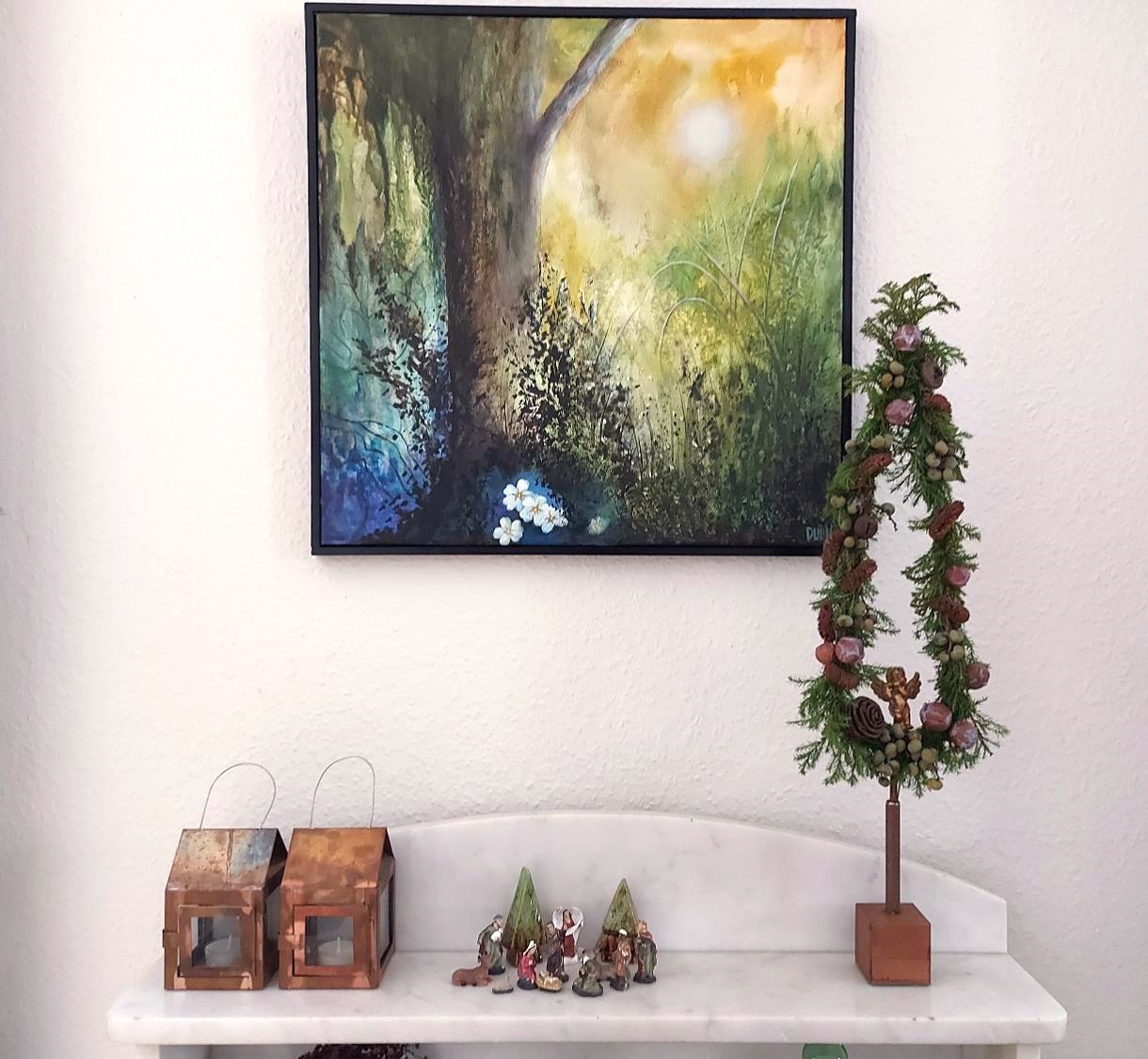 Jeg startede med at binde blød ene hele vejen omkring træet og lade lidt gå op over træets spids. Derefter er resten af pynten limet på. Naturfarver skulle det være, for træet skulle spille op til maleriet, der hænger over servanten. Det billede bliver jeg med at kunne fortabe mig i.