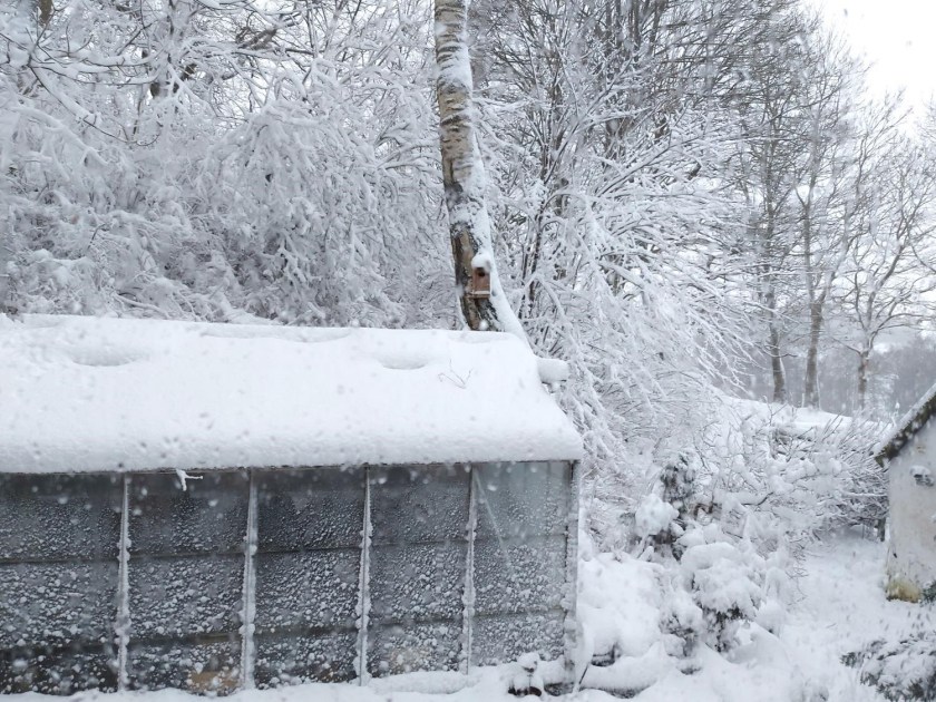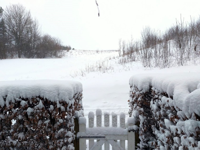 Siden vi gik i seng i går, har det sneet. Alt er hvidt, og sneen ligger tommetykt.