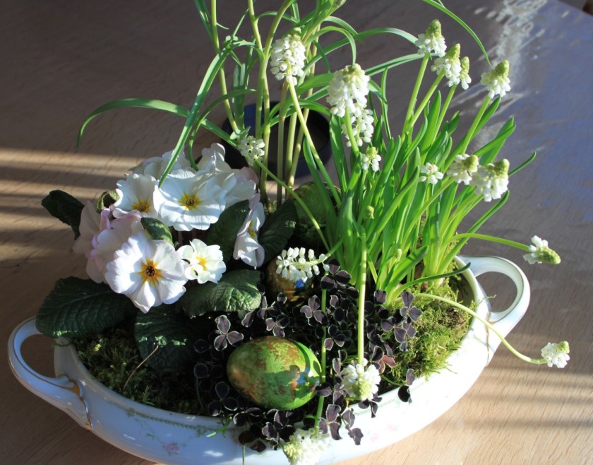 Anderledes var det med det store fad med forår fra et par år siden. Det krævede både mange planter og en del pleje og udskiftning. Men flot var det.
