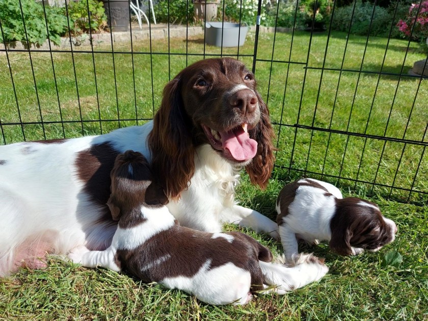 Vejret var fantastisk i maj, og det var en fryd at være ude og i haven. Men det mest spændende i maj var nu ankomsten af Maggies fem små hvalpe. Bittesmå, blinde og døve, men med næse for mad.