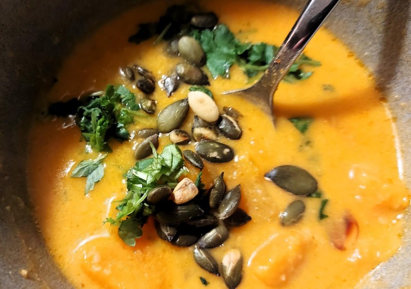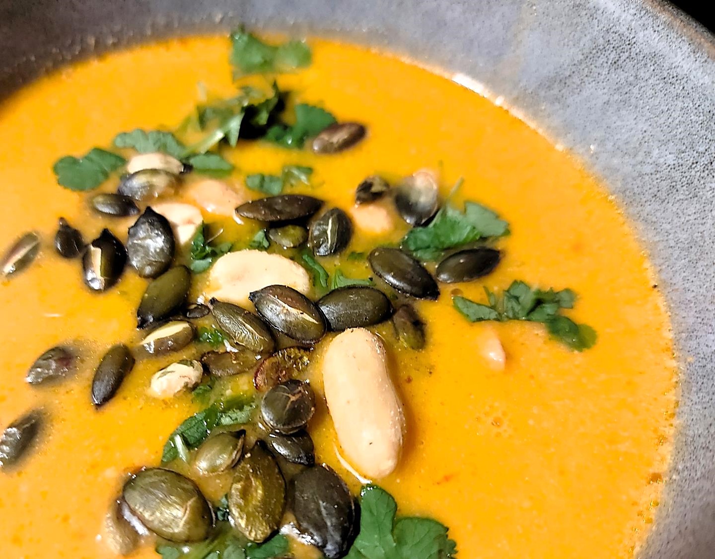 En eksotisk suppe med masser af smag. Søde kartofler, peanuts, rød karrypasta, kokosmælk, ingefær, løg og hvidløg. Det er det, der tilsammen bliver til den her cremede, krydrede og skønt orange suppe. En ‘selvom jeg er mæt, kan jeg altså godt spise en lille smule mere’-suppe.
