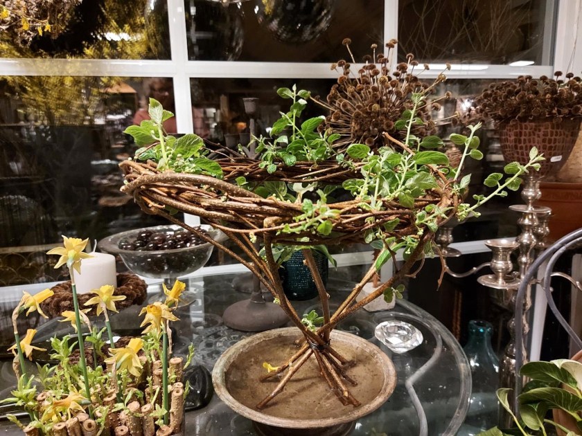 Har man ikke selv krukker og skåle med til pilestativerne og dekorationerne, kan man købe dem hos Aase. Hun har også et udvalg af blomster til krukkerne, pynt og smukke jernstativer. Man kan bare gå rundt der i timevis.