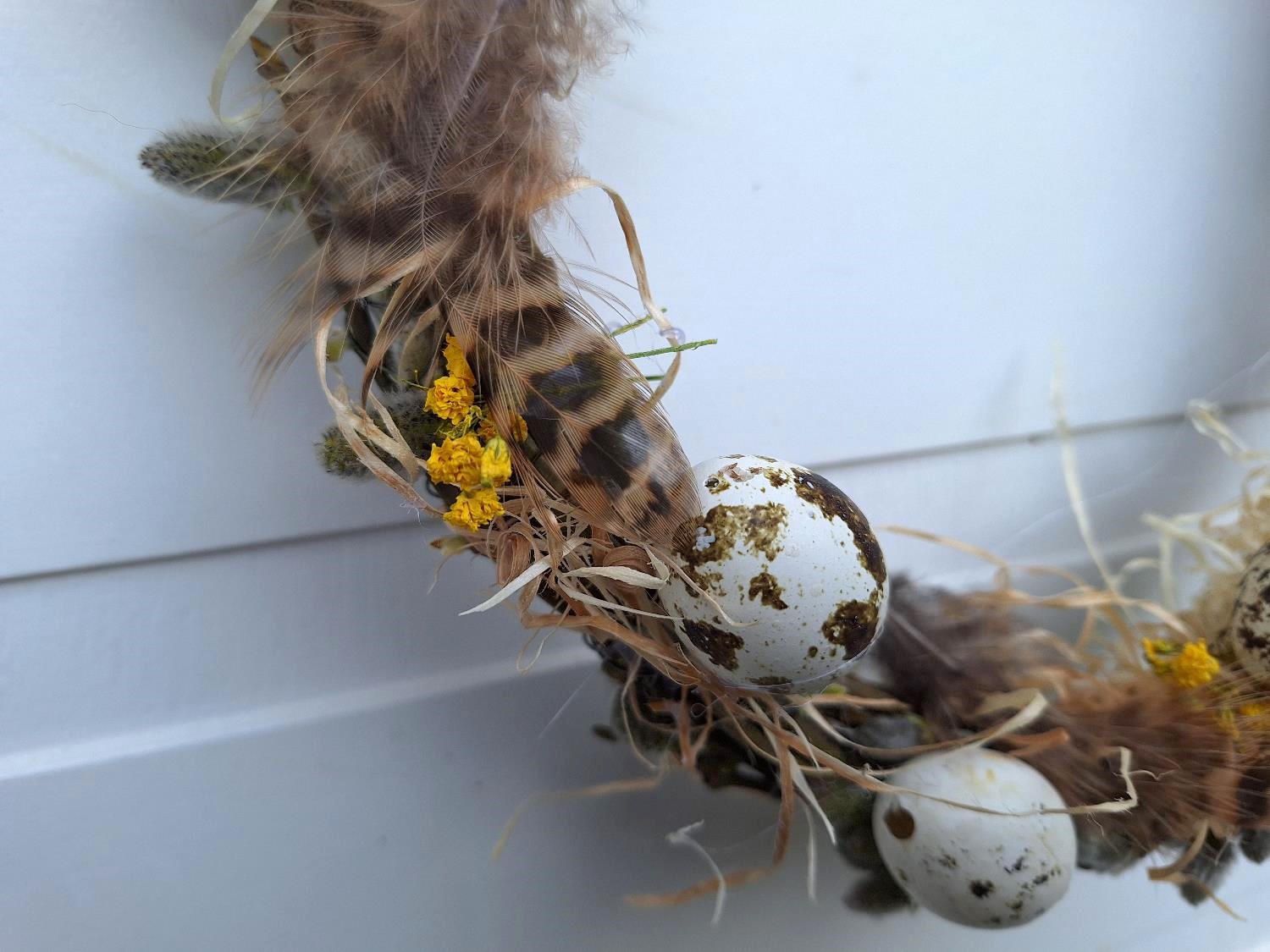 Resten af pynten er træuld, gemt fra en firmajulegave – man skal ikke lade noget gå til spilde, vagtelæg og små fasanfjer. Fasan er måske ikke lige den fugl, man forbinder mest med påske, men de får jo også kyllinger, ikke? Og fjerene havde jeg hapset fra husbondens jagtbytte i vinter.