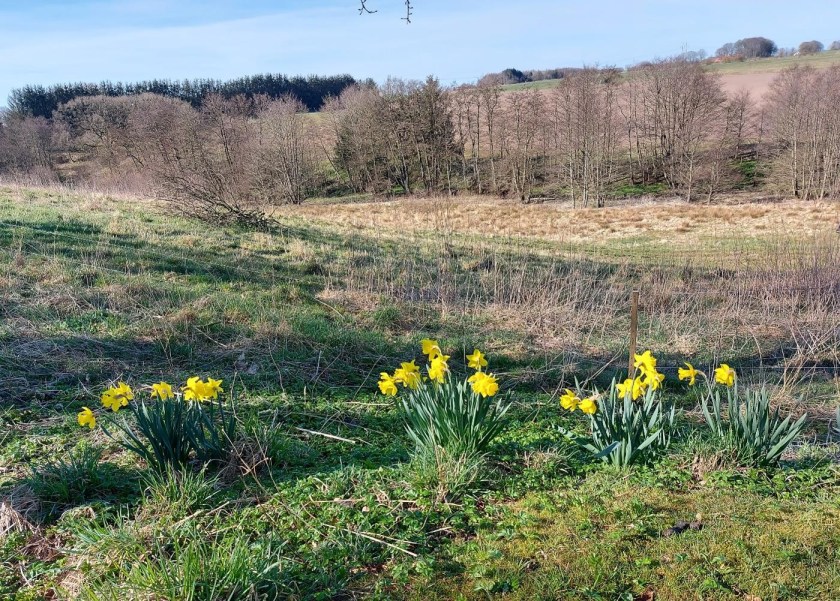 I haven er påskeliljerne sprunget ud – lige til tiden. Påskeliljer er sådan en dejlig blanding af halvvild og haveplante. Mange steder langs med vejene har en fugl på et tidspunkt tabt et frø, og med årene er de frø blevet til klumper af lysende, gule påskeliljer til glæde for alle, der kommer forbi. De lyser op i den ellers så bare natur.