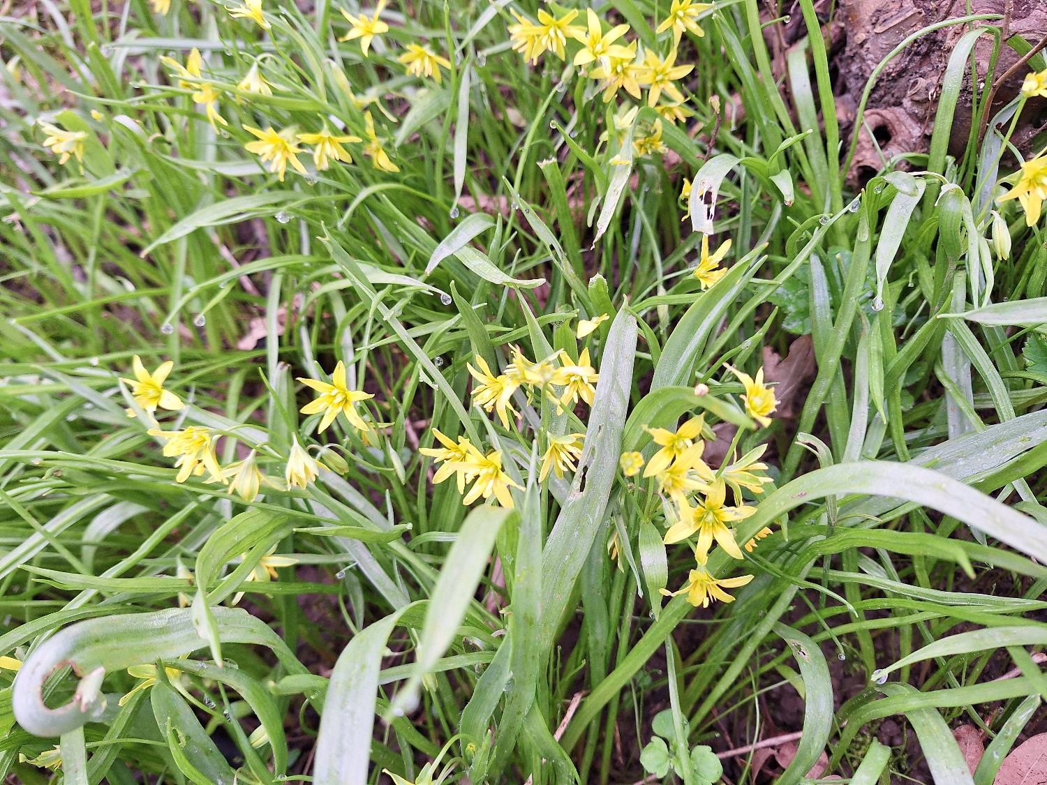 Også de små guldstjerner er sprunget ud. De er ikke halvvilde som påskeliljerne, men helvilde og påskegule, og de er også så velkomne.