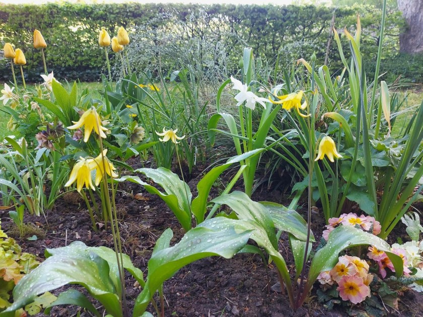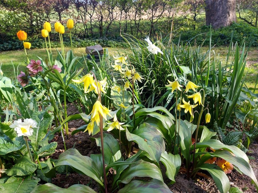 Hundetand fås i mange udgaver, farver og faconer. Der kunne sagtens findes plads til dem flere steder, men det har ikke været nemt at finde løg. Hvis du kender til et sted, hvor de sælger løgene, vil jeg meget gerne høre om det. Helst her i Danmark, for de der kasser med 100 løg fra Holland er lidt for meget og lidt for meget løglæggeri til mig og mine knæ.