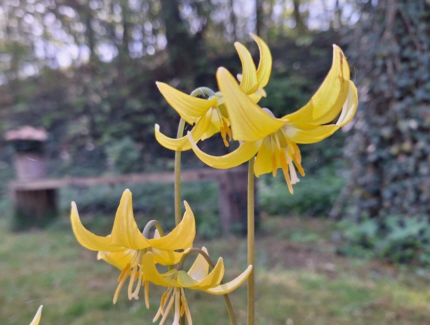 Hundetand har det godt i skovhaven. De blomstrer nu, og efter blomstringen forsvinder de helt fra jordens overflade. Næsten som anemonerne. Det passer fint derude, hvor der ikke er meget, der kan blomstre, når trækronerne lukker sig over haven. Ser man på kortet, er det meste af vores have mærket som ‘skov’, og det passer vist meget godt.