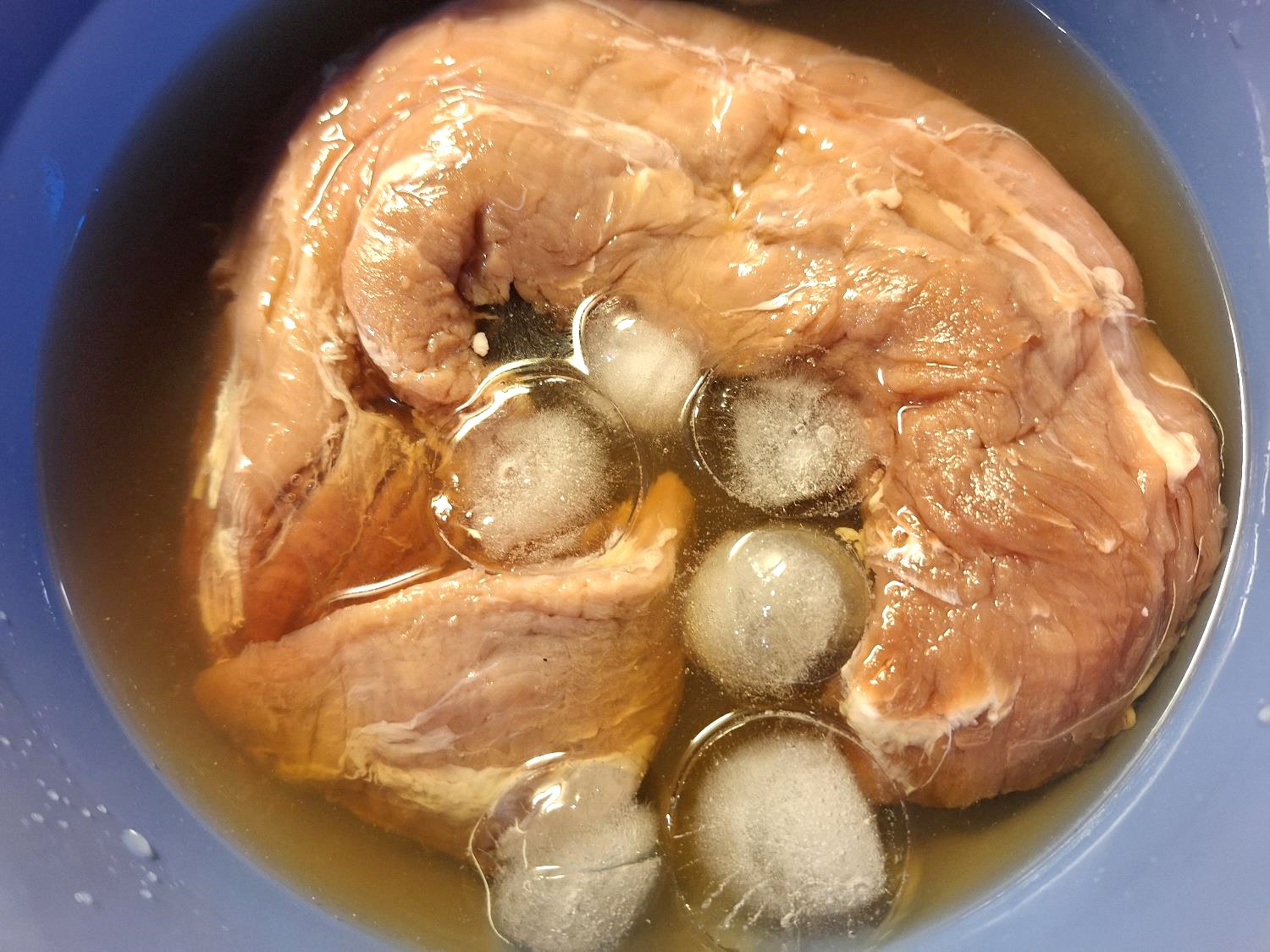 Opløs salt og sukker i det varme vand, tilsæt resten af ingredienserne inklusive isterningerne og læg mørbraden i. Lad den ligge i 20 minutter. Det er nok. Isterningerne er der for at køle marinaden ned, så den hurtigt er klar til brug. Måske gør de også et eller andet, men det vidste ham kokken altså ikke. Han ville bare ikke udelade dem.