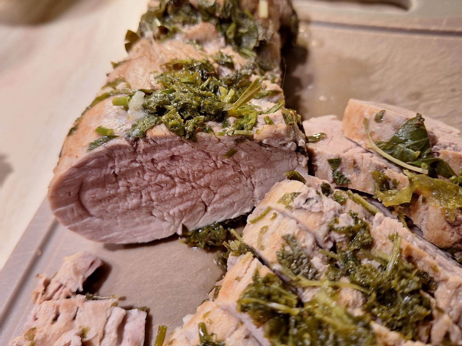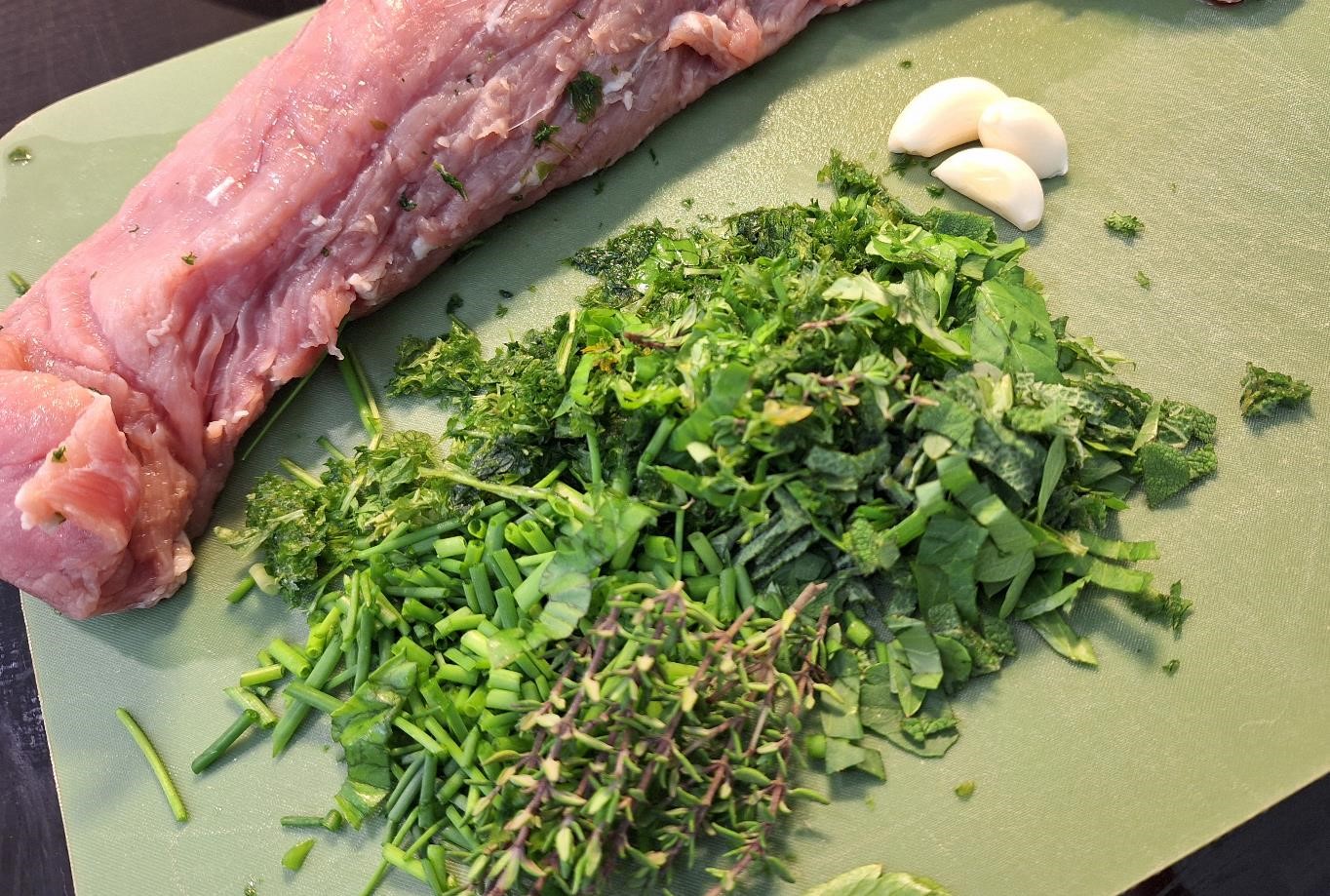 Vi prøvede det for et par dage siden. Marinerede mørbraden, brunede den på panden og pakkede den i folie sammen med krydderurter fra haven. Salvie, rosmarin, purløg og timian – og et generøst tilskud af basilikum fra potten i køkkenvinduet.