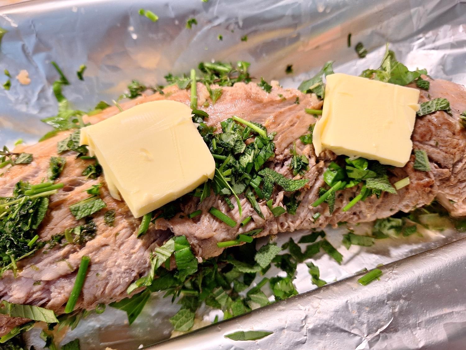 Til sidst fik den et par smørklatter, og så blev den ellers pakket ind og bagt på 200 grader i små 20 minutter.