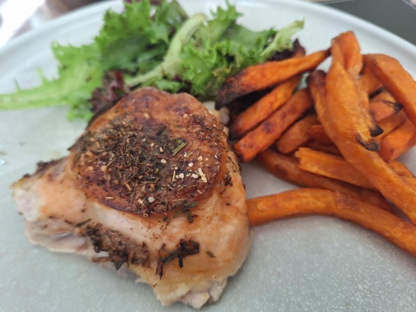 Har du nogle gode, nye kartofler, er de bare det bedste tilbehør. Har du ikke, som det var tilfældet hos os, er en pose søde kartoffelfritter fra fryseren et godt alternativ. Saften fra fadet smager rigtig godt som sovs og dens friskhed fra citronerne klæder de søde kartofler.