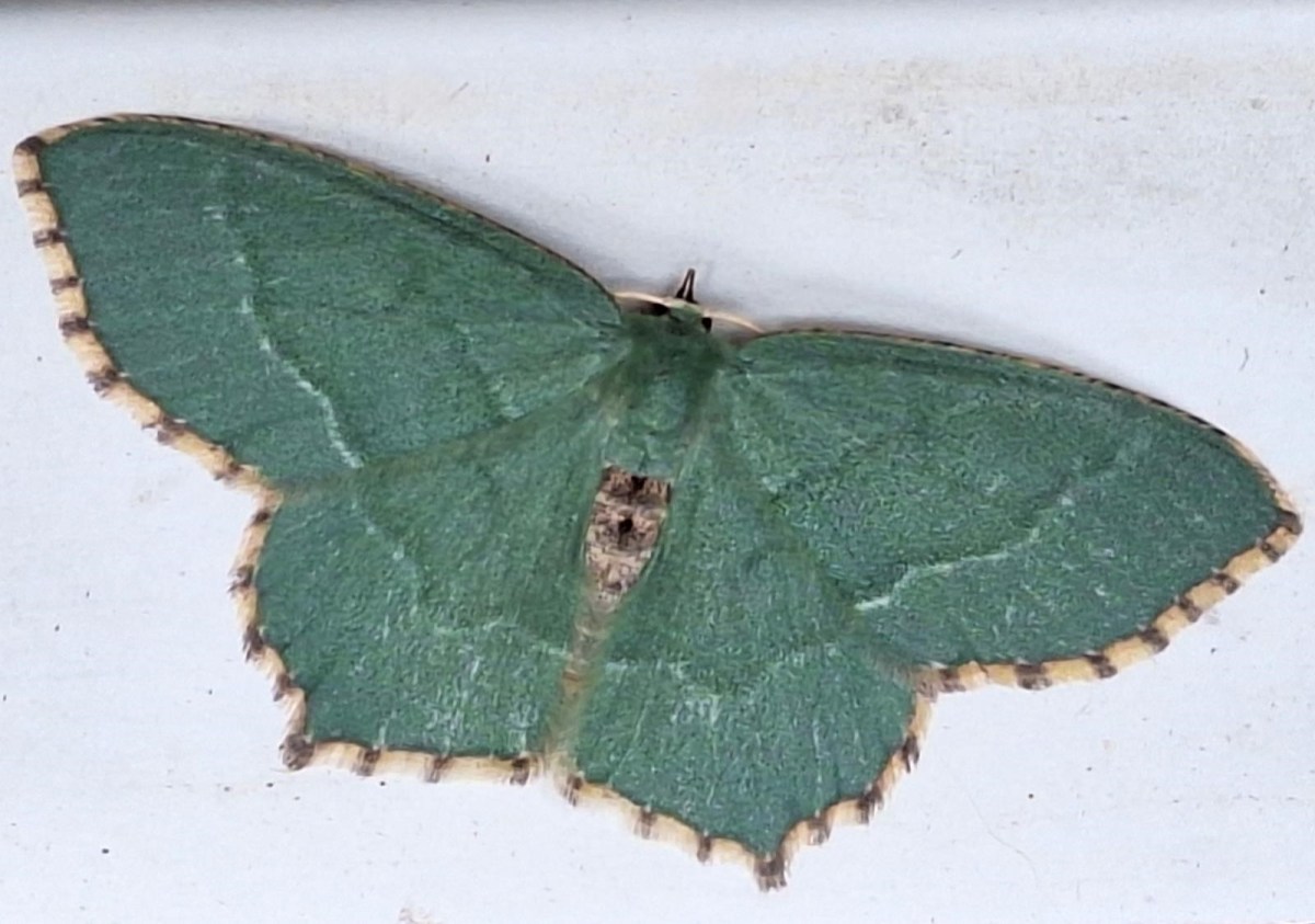 Et af naturens små undere: en grøn natsværmer, en lundmåler. Ikke ualmindelig, men jeg har ikke set den før, og jeg blev helt betaget af dens smukke, vissengrønne farve og vingernes fine, stribede kant.