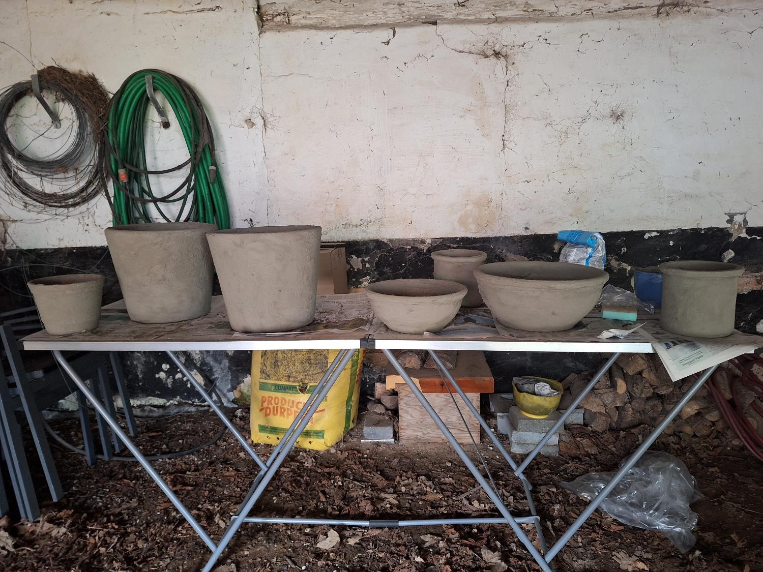 Krukkerne blev fundet frem, tørret af, stillet på det gamle tapetsererbord inde i det gamle vognly, og så fik de første tur. Pulveret blev rørt op med vand (brug lidt ad gangen, det rækker langt, og det tørrer ind ret hurtigt), og blandingen blev smurt i et tyndt lag på krukkerne med en skuresvamp.