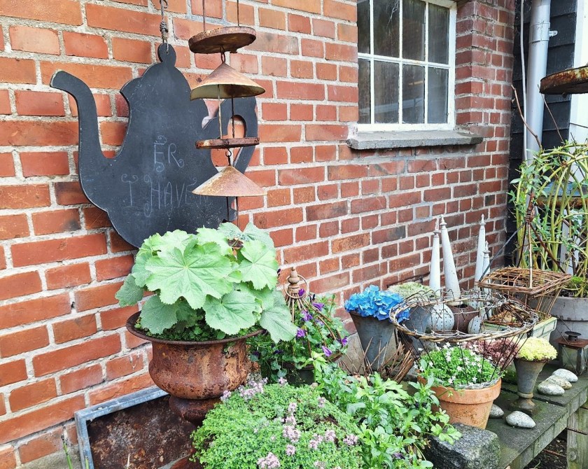 Og omkring alle hjørner, på bænke, på søjler – ja alle vegne og hist og her – står nogle af Aases dejlige dekorationer.