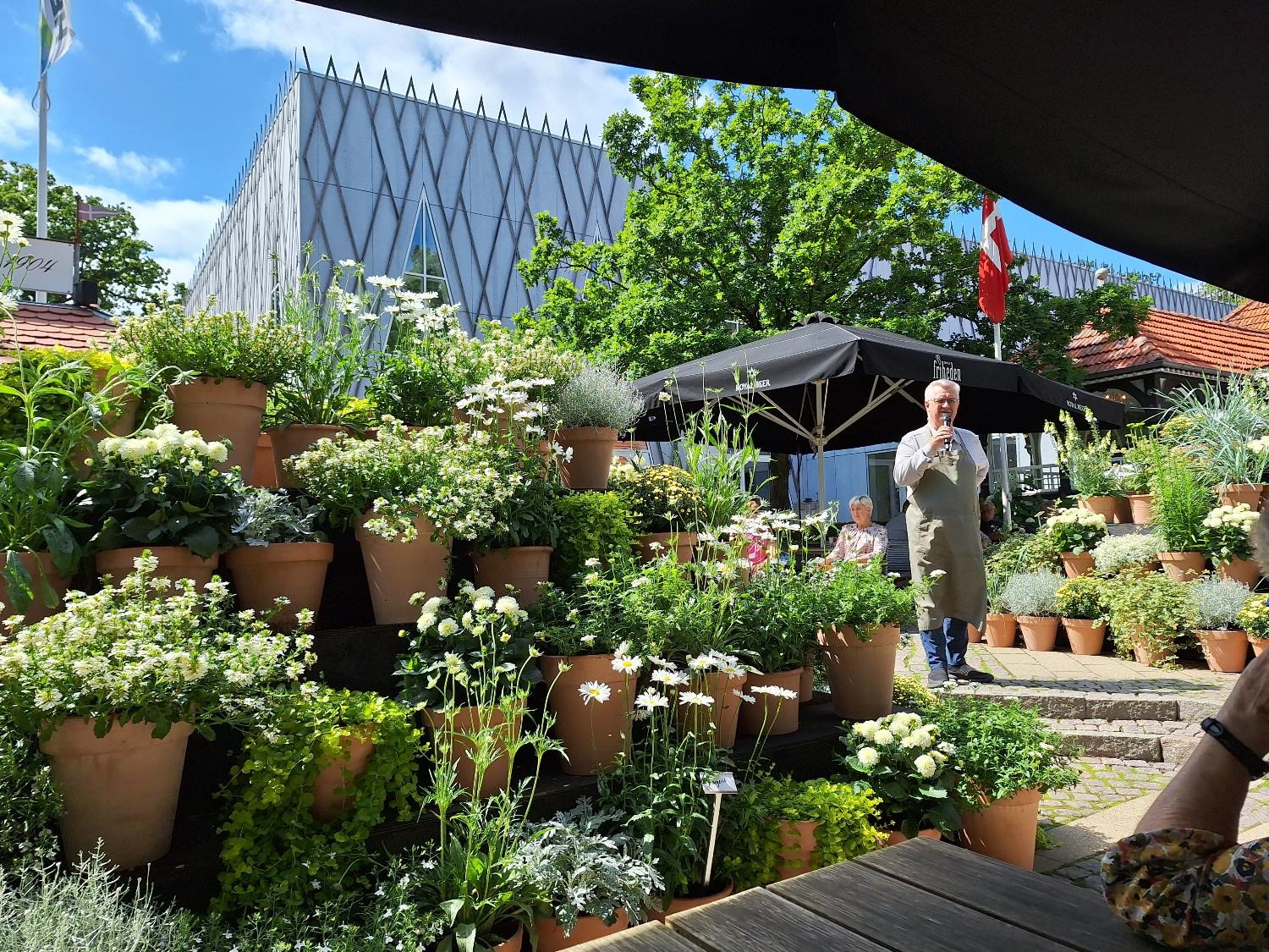 Vi to gamle, der bare kom for blomsternes skyld og for at høre et af Claus Dalbys hyggelige foredrag om krukkehaver,