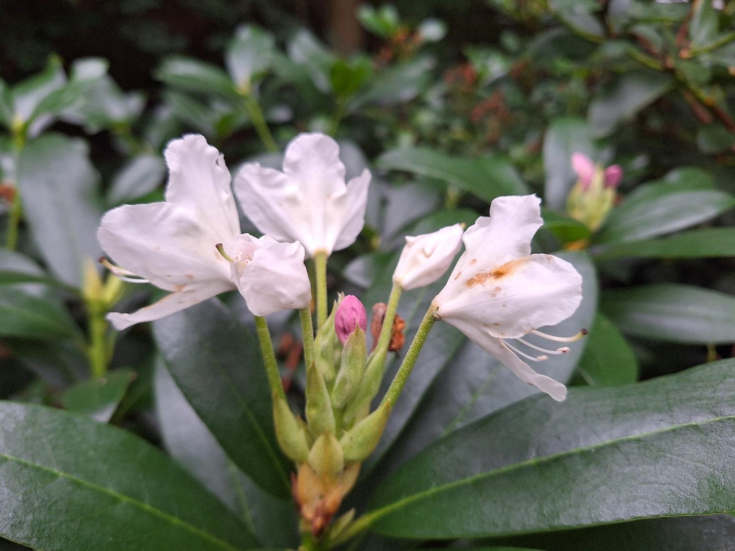 Det er som regel en mindre blomstring, for de fleste knopper har ret godt styr på kalenderen. Vores hvide rododendron har bare ikke rigtig styr på den. Den er begyndt på en ny blomstring, ikke helt så overdådig som i maj, og heller ikke med lige så store blomster. Men den gør sit bedste.