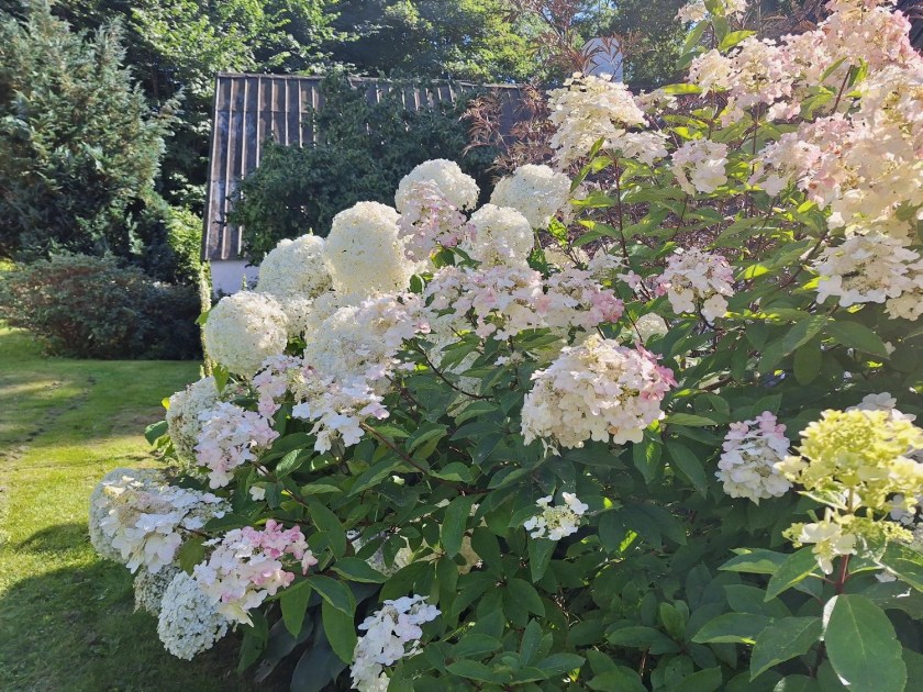 Men det er rigtig synd for dem, der skal have åben have. August er (også) en uforudsigelig måned. Jeg besøgte Hanne Moldts have efter en nat med regn, og helt ærligt: der var skønt alligevel. Regn og blæstskader en uundgåelig del af at være en dansk have.