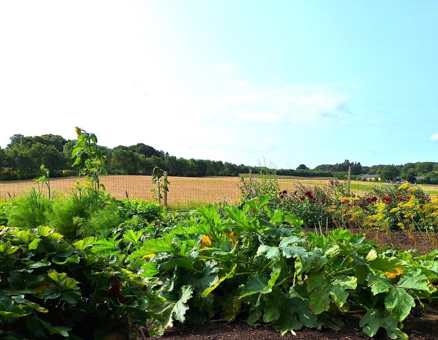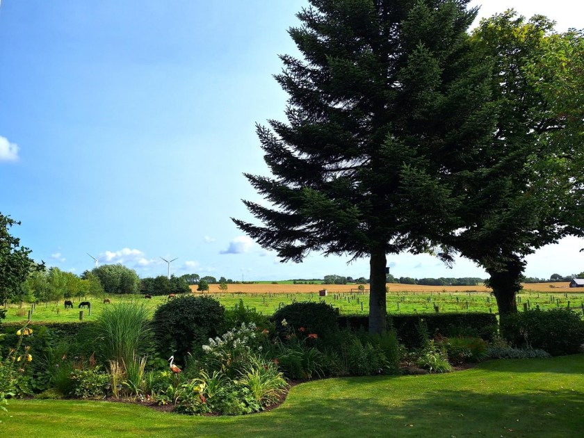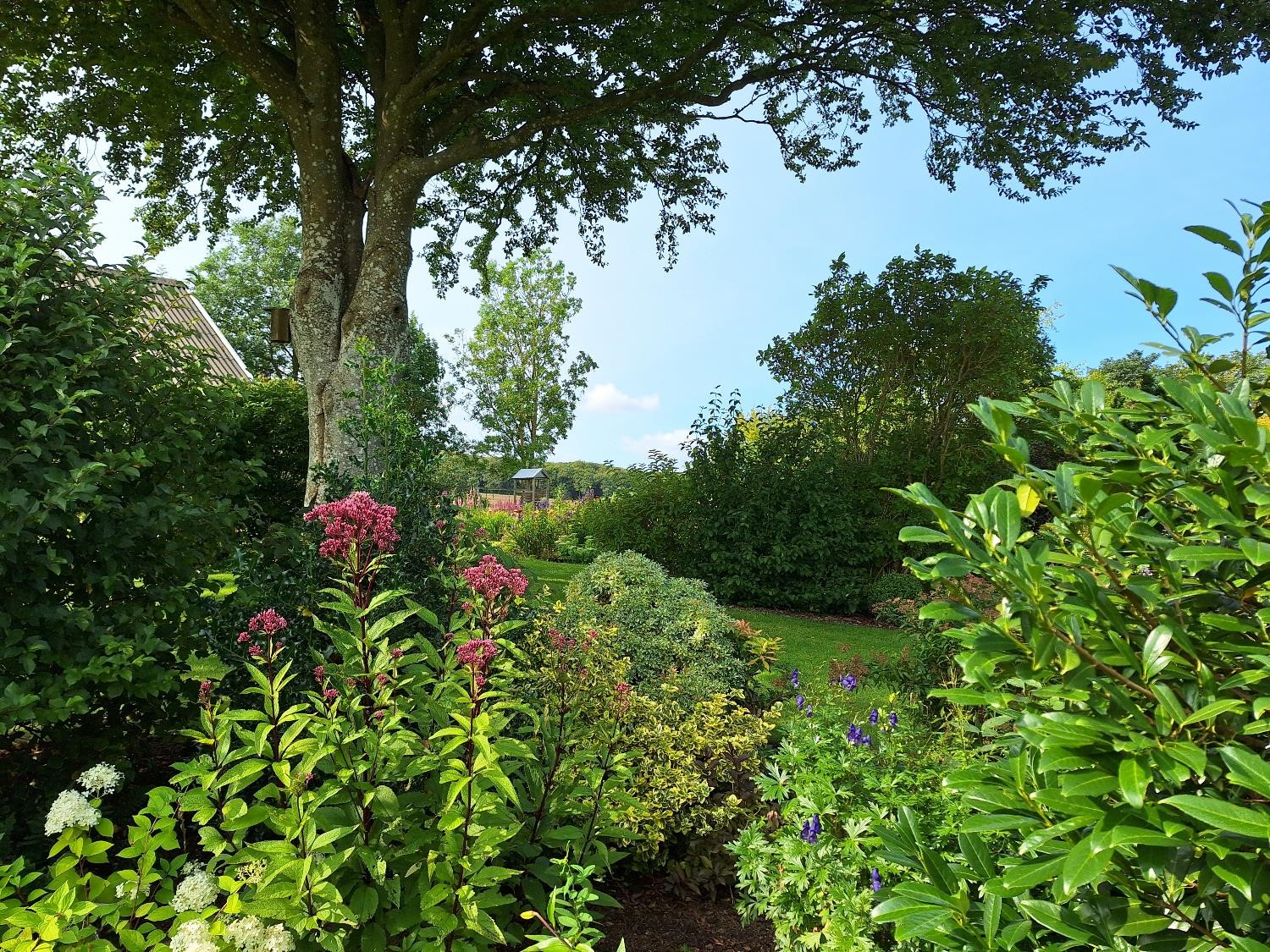 og dejlige kig ud over landskabet, når man går ad græsstierne mellem bede med blomster og buske. Her er højt til himlen, hyggelig stemning og en følelse af ro.