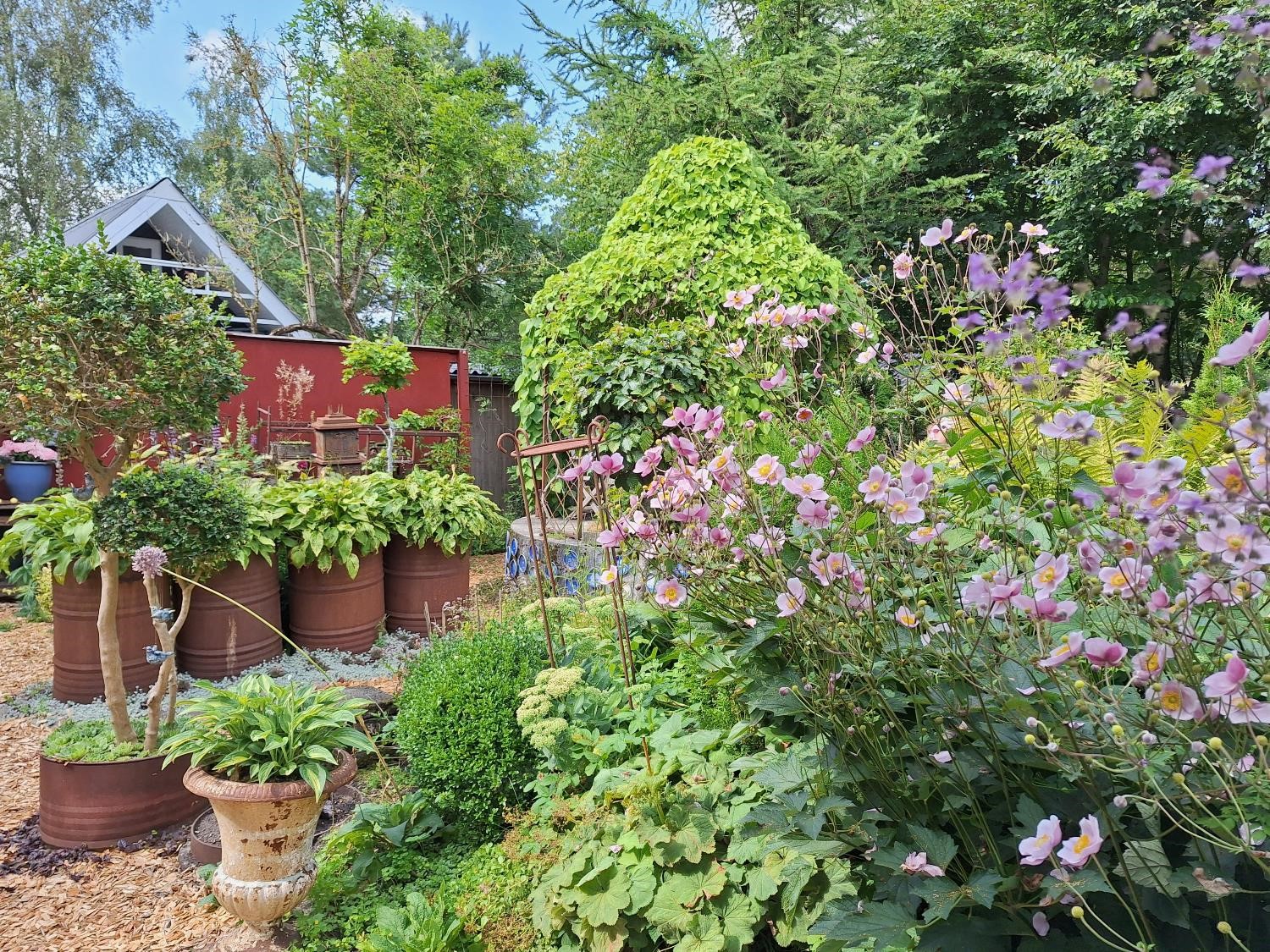 Der er bede, bassiner og virkelig kreativ brug af olietønder. Rustne tønder i fuld størrelse, der bugner af store hosta. Overskårne tønder fyldt med planter. Krukker og planter plantet i diverse beholdere alle vegne.