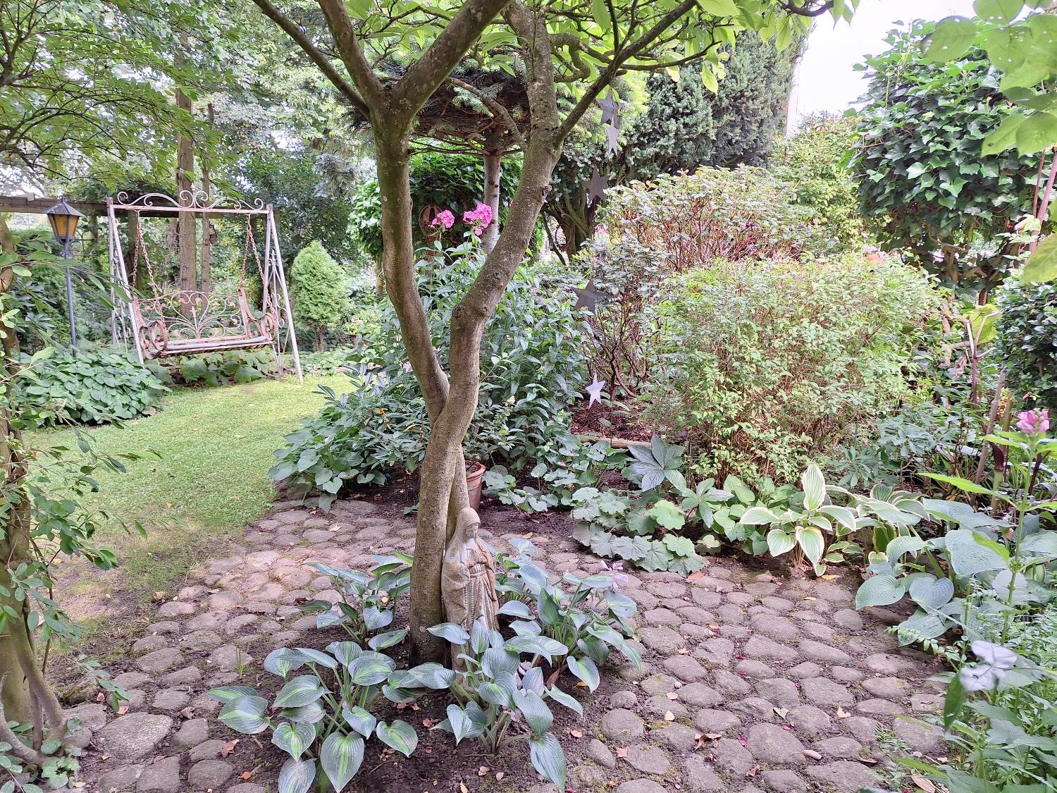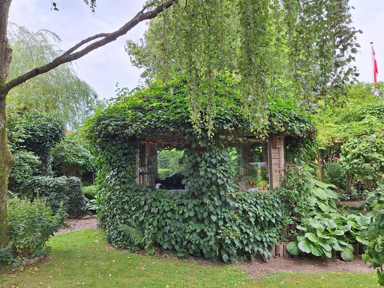 Der er krukker, der bugner af blomster, figurer – og siddepladser spredt rundt omkring i hjørner og kroge – og indtil flere hyggelige havehuse.