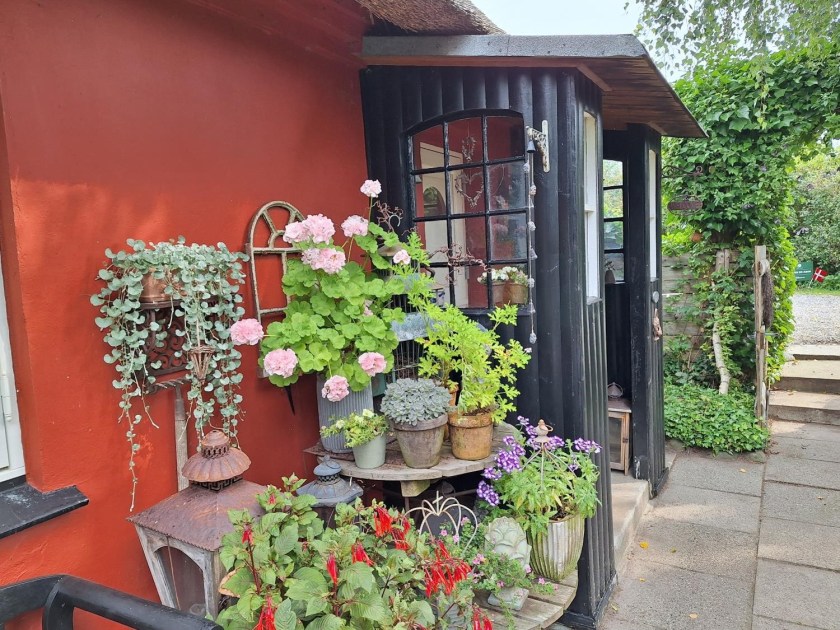 Når man kommer ind ad havelågen er det første, der fanger øjet, det smukke, gamle hus. Man ser de store træk, og så glider blikket videre til de charmerende indgange, der er omgivet af blomstrende krukker og havepynt.