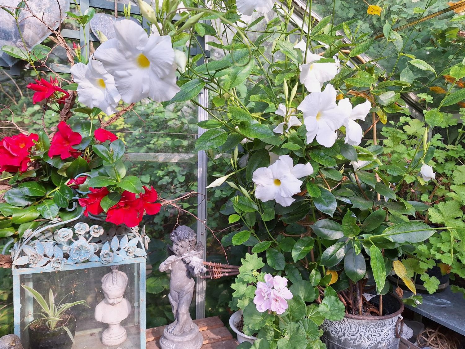 Når regnen trommer på taget, kan jeg snige mig rundt i min egen jungle, hvor pragtlilje, dipladenia, hibiscus blomstrer, og duftgeranier parfumerer luften. Det eneste, der mangler, er nogle skræppende papegøjer, men det kommer nu ikke til at ske 🙂
