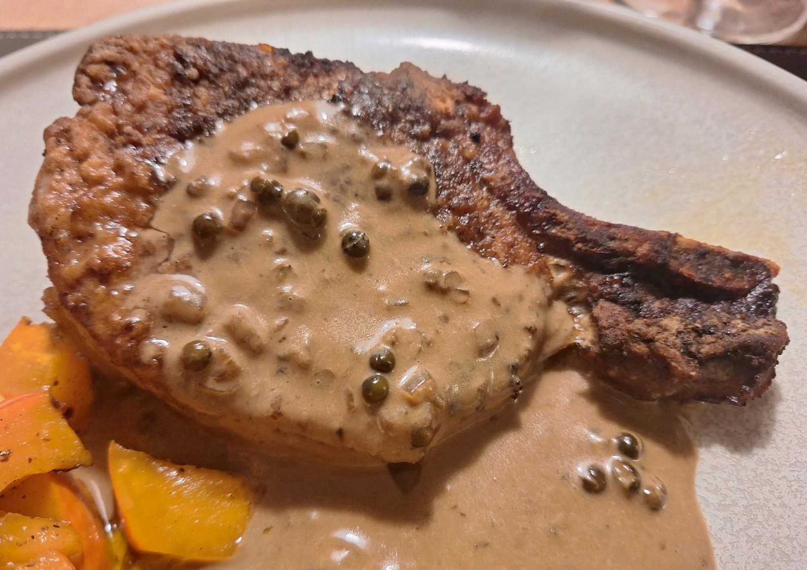 Vi fik årets halve gris i weekenden, og da alt var pakket ned og puttet i fryseren, syntes vi nok, vi havde fortjent en kotelet til aftensmaden. Men uanset, hvor frisk, stor og god en kotelet er, er den jo egentlig en lidt neutral ting. Den kræver godt tilbehør og en god sovs, men der er jo ikke rigtig noget at lave sovs af. Her kommer den lille dåse med peberkorn ind i billedet.