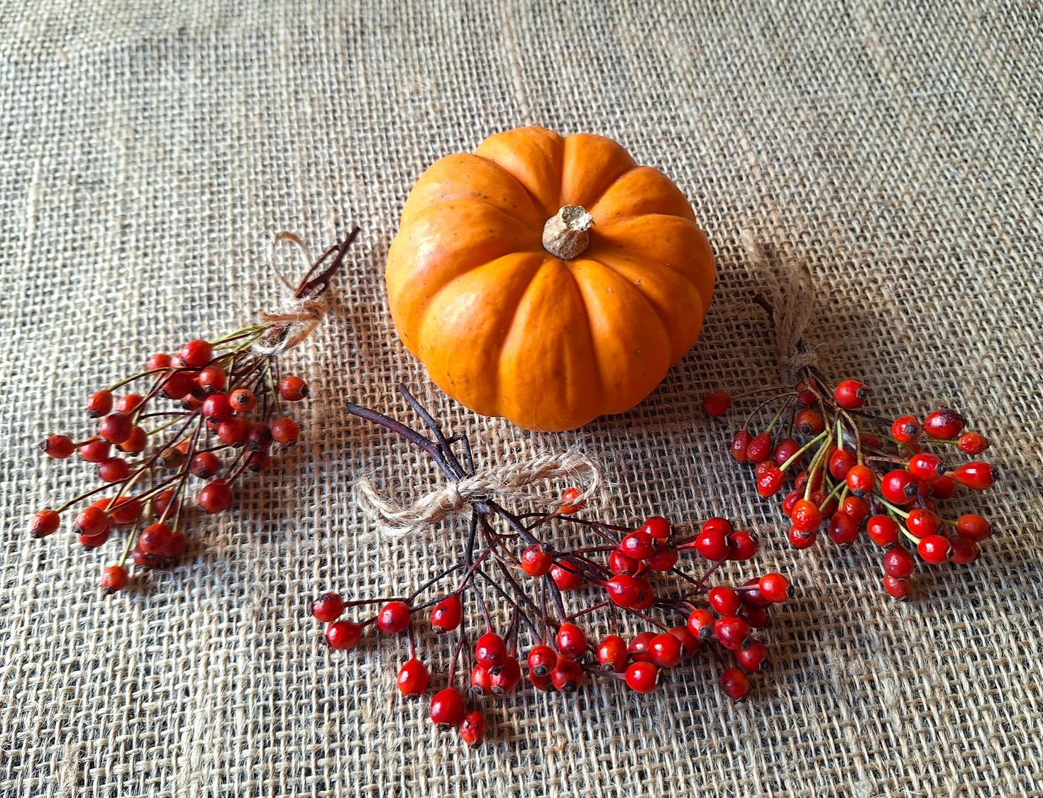 Jeg havde brugt en ret neutral og lidt kedelig, mørkegrå voksdug til bordet. Den blev frisket op med bordløbere af sækkelærred – sådan noget ‘julemandens sæk’ stof – og pyntet med masser af bittesmå buketter af Mariebær og nogle små græskar, jeg faldt over i Decoplants blomsterbutik i Herskind, da jeg var nede efter begravelsesbuketten til dagen før.