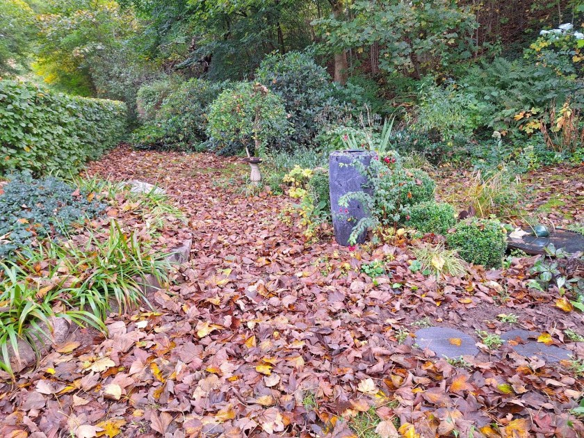 Solstrejf bliver klippet til glimt af grenene, der bevæger sig i vinden, og hvert vindpust føjer flere blade til bunkerne. Det er ved at være tid til at komme ud med bladriven og trillebøren igen. Men ikke i dag.