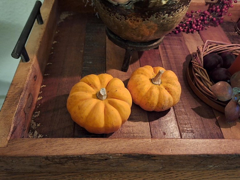 De små græskar er dem, jeg købte til vores fælles fødselsdagsfest for en måned siden. De har været meget omkring i stuen nu, og de holder stadig fint. De skal pynte, lige til det bliver tid til juledekorationerne.