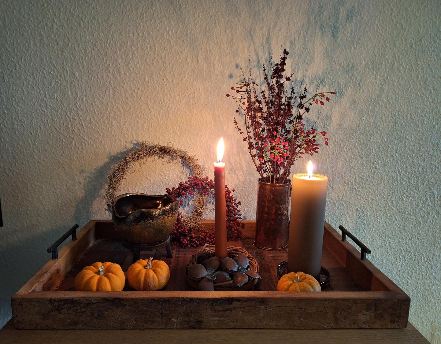 Måske har du også en bakke eller et fad i gemmerne, du kan sætte efterår på? Så kan du også – når du kommer ind fra efterårets lys, lyde og dufte – tænde lys og sætte dig i sofaen med et tilfreds suk.