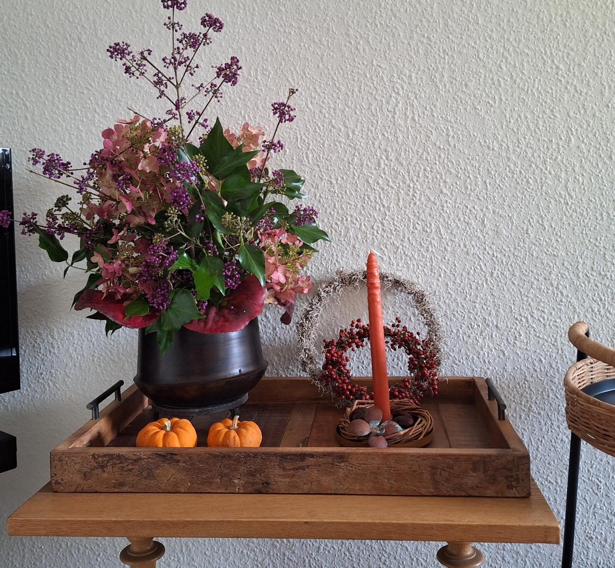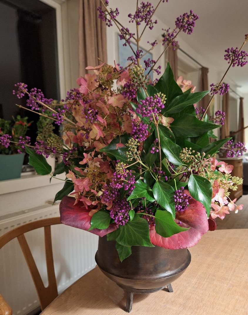 Den store dekoration i metalkrukken med kobberskær er med røde blade fra kæmpestenbræk, glasbær, blomstrende efeu og hortensia. Jeg har sat krukken op på en trefod, så den får endnu mere højde og lidt lethed, så den ikke bliver alt for bombastisk.
