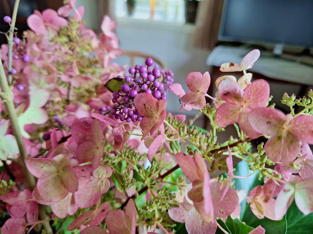 Naturen og haven skal også hives ind i stuen. Dekorationer skal der til. Der er stadig meget at hente derude i haven, i skoven og i hegnet. Grene med bær, frøstande og ikke mindst hortensia.