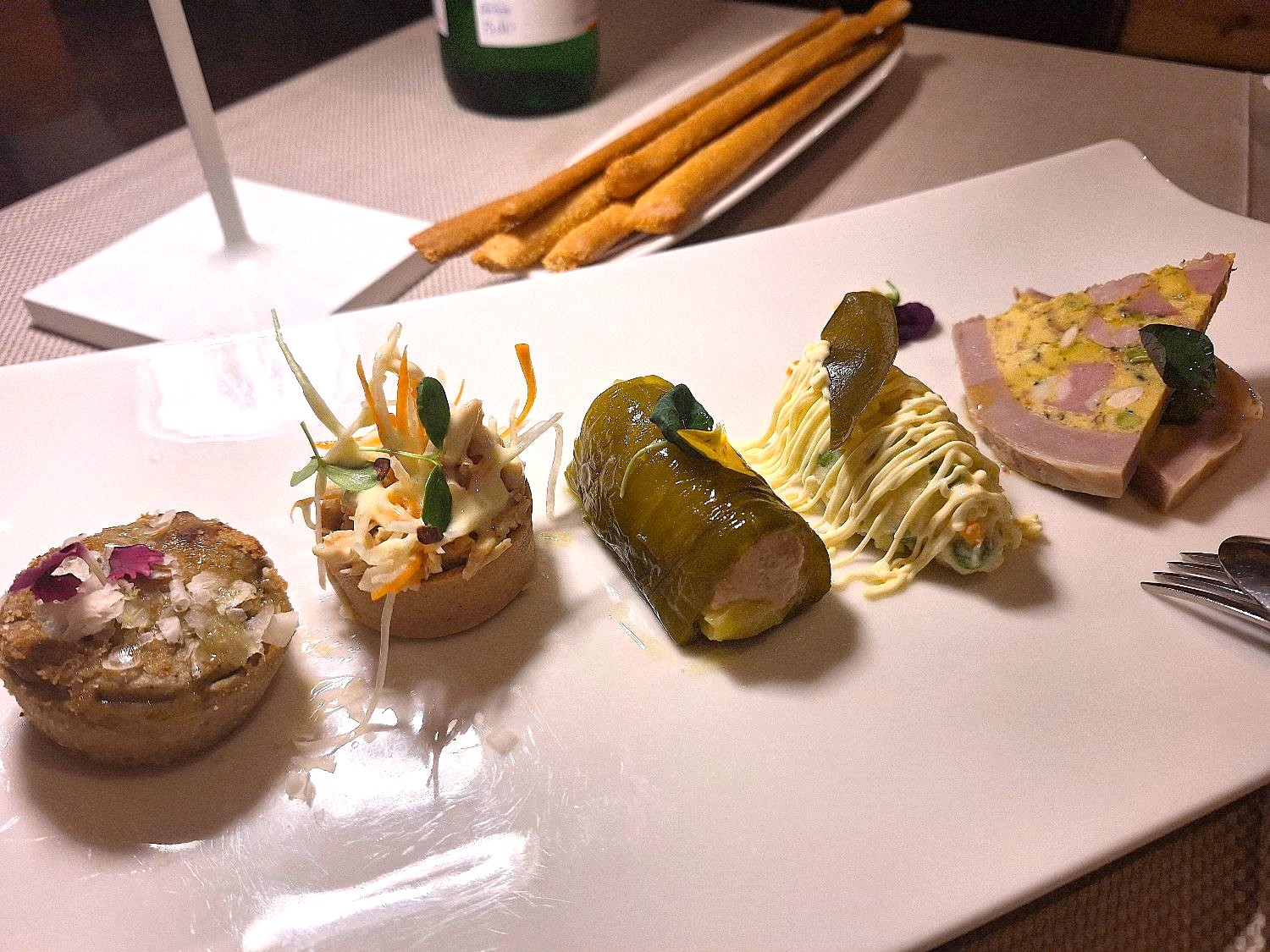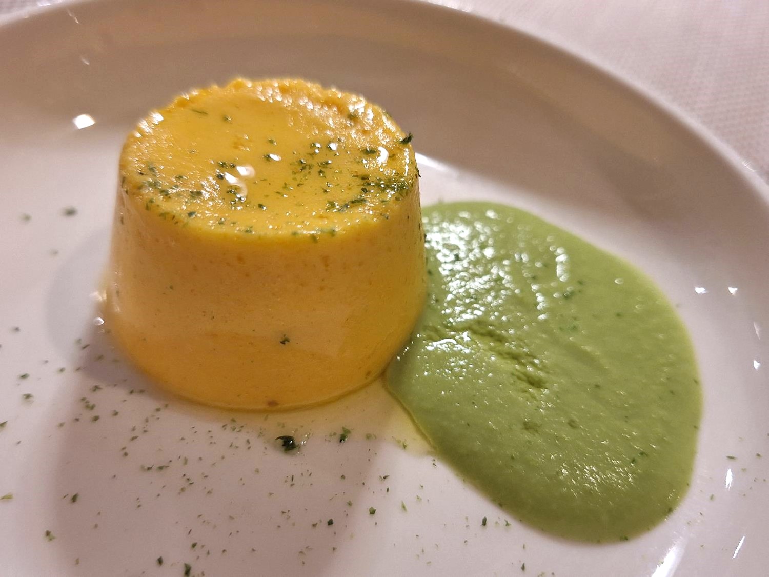 Forretten var en fin anretning med lokale specialiteter. En grøntsagsflan med ærtesovs som en velkomst fra køkkenet,