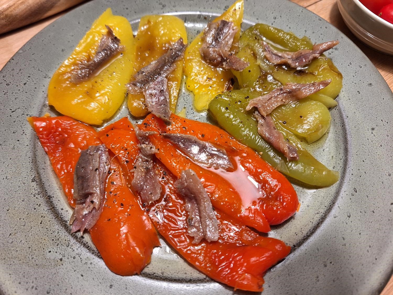 Peberfrugterne skal grilles i ovnen, til skindet bobler op og bliver brunt. Så tager man dem ud af ovnen og lægger dem i en skål med film over, til de er kølet af, og trækker skindet af dem. Skær dem i passende stykker, læg dem på et fad, dryp med olivenolie, kværn godt med peber ud over og pynt med ansjoser. Nemt og rigtig, rigtig lækkert.