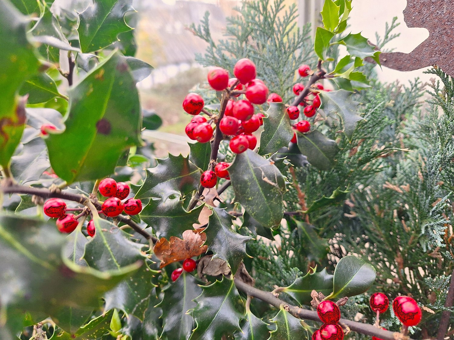 Kristtornen har så fine bær i år. Dem plukkede jeg en masse af, for når det bliver koldt, spiser fuglene dem. De kan få nogle solsikkefrø i stedet for, kan de. Bærrene tager jeg.