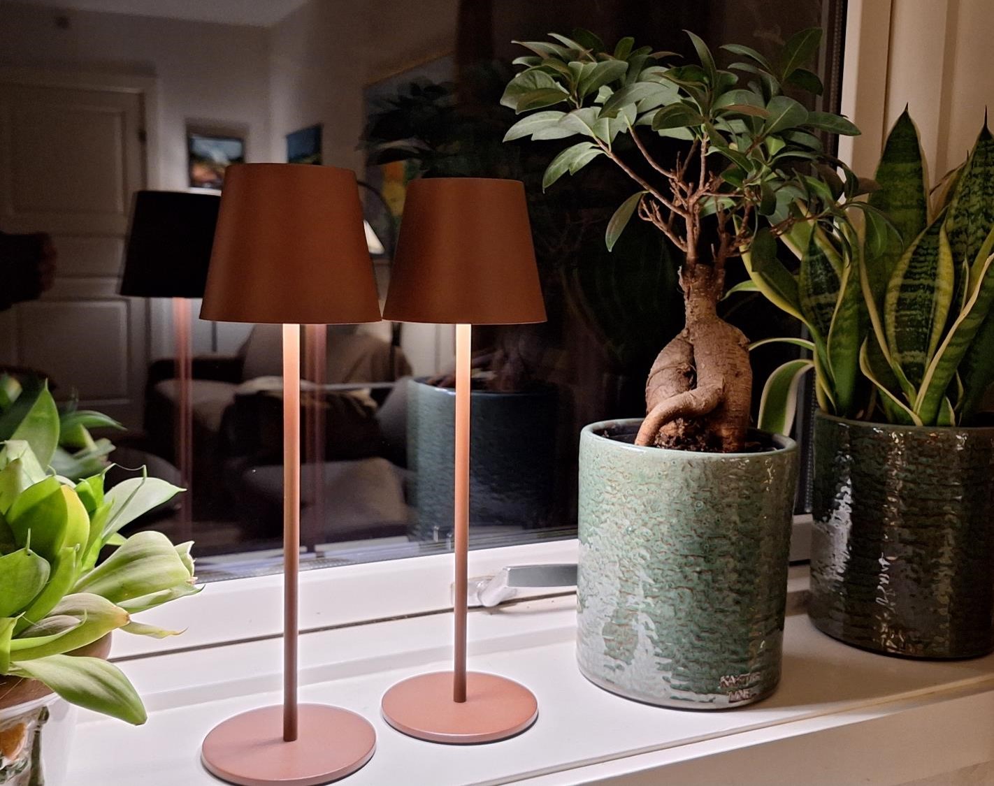 Men i år har vi skejet lidt ud og suppleret med to genopladelige lamper. Det er den slags, man kalder restaurantlamper, og vi så dem da også første gang på en restaurant i Italien, hvor de stod på bordene og gav et fint og klart lys.