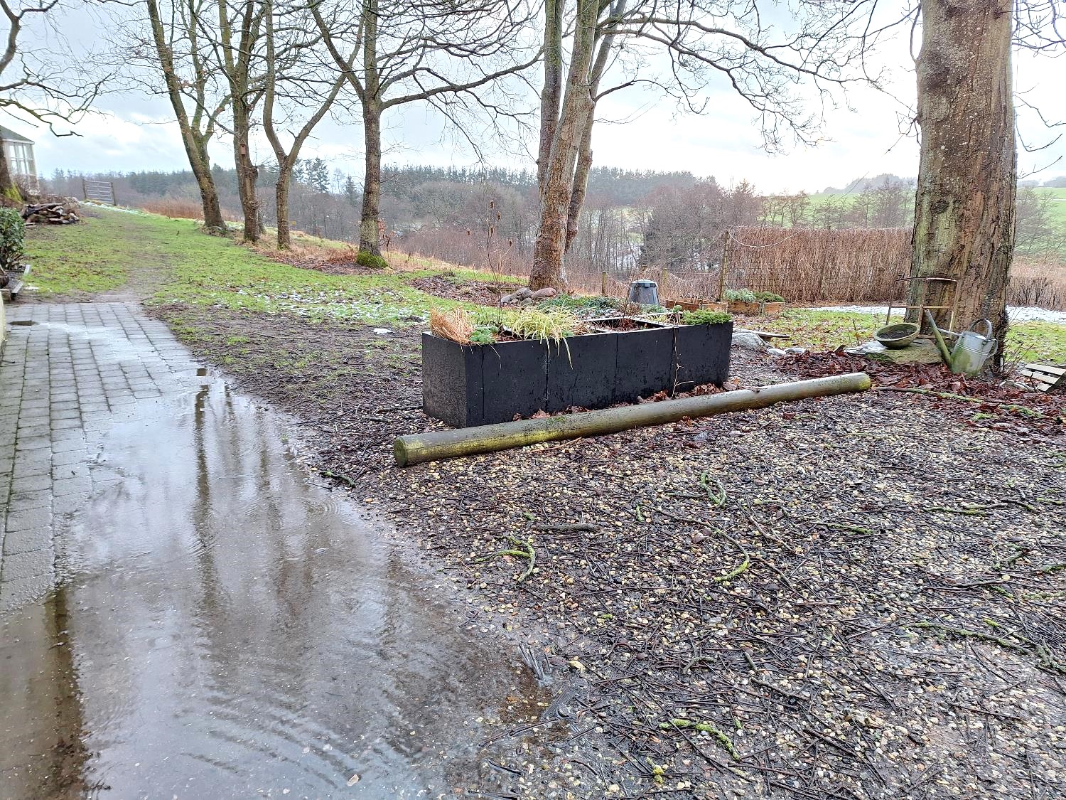 I går morges var alting hvidt. Det sneede tæt, og den våde tøsne satte sig på grene og blade og gjorde alting meget pænere, end det ellers er i fri dressur i januar. Da jeg kom hjem fra arbejde – det var by-dag i går – var alt forvandlet til et mudderbad med blanke pytter.