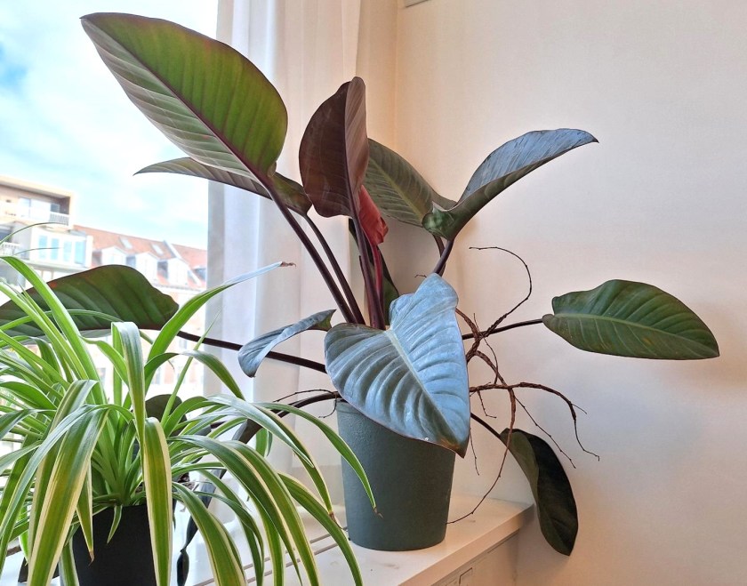 Den femte er en af dem, der allerede er ved at vokse sig for stor til vindueskarmen. Det har jeg prøvet før med monstera – monsterplanten. Men dens enorme, gummiagtige blade er en fin kontrast til de andre planters mere mådeholdne størrelse, og den må stå der, til der ikke er plads til den mere. Jeg ved ikke, hvad den hedder, men du kender den sikkert, når du ser bladene.