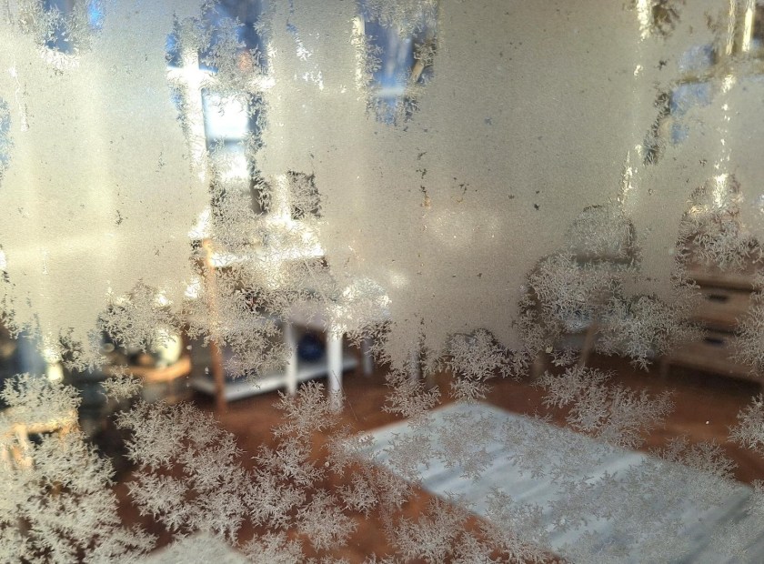 Frost på græsstrå i engen, og isblomster på pavillonens ruder.