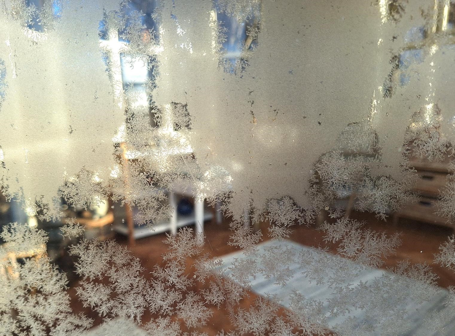 Frost på græsstrå i engen, og isblomster på pavillonens ruder.